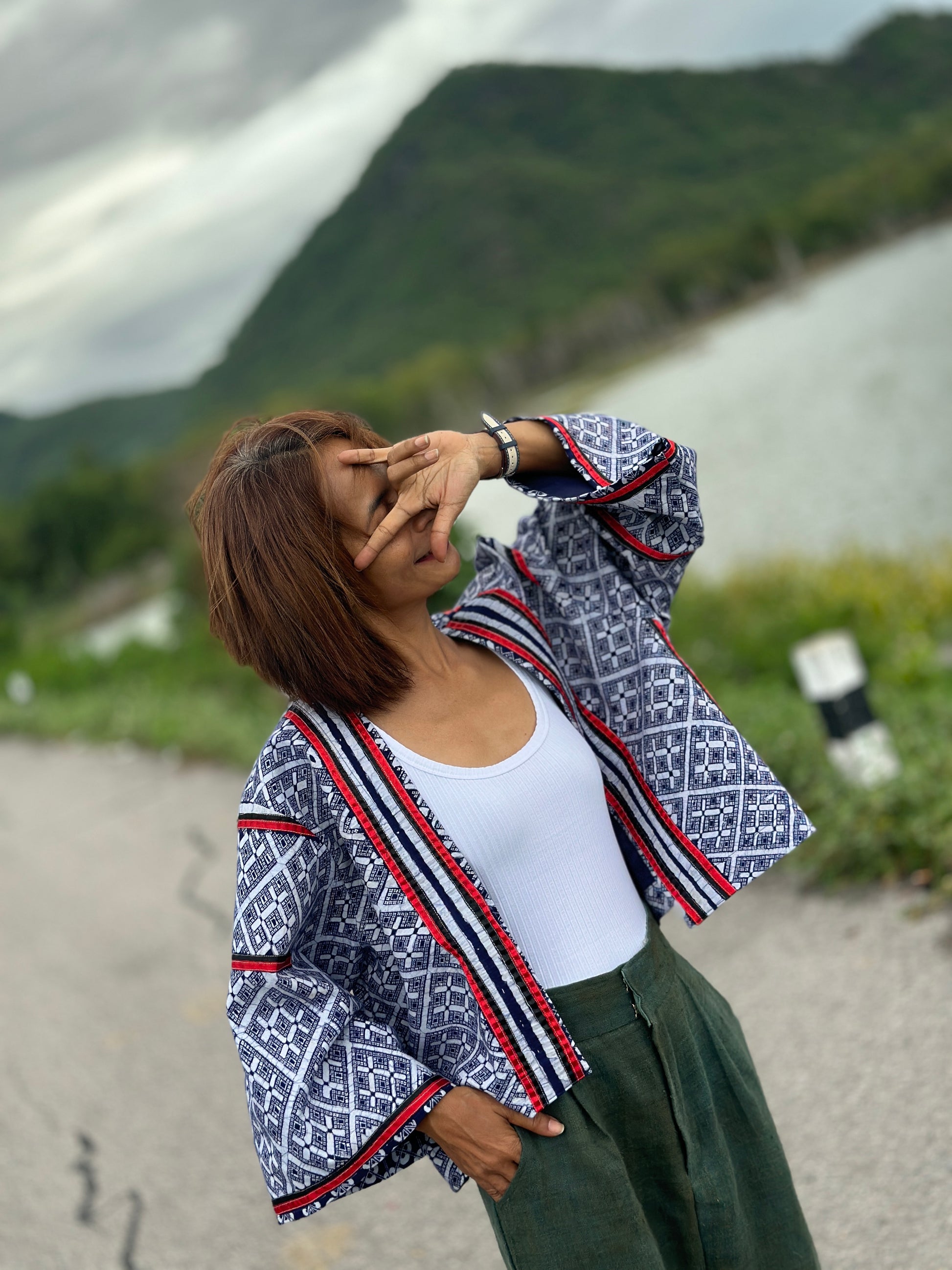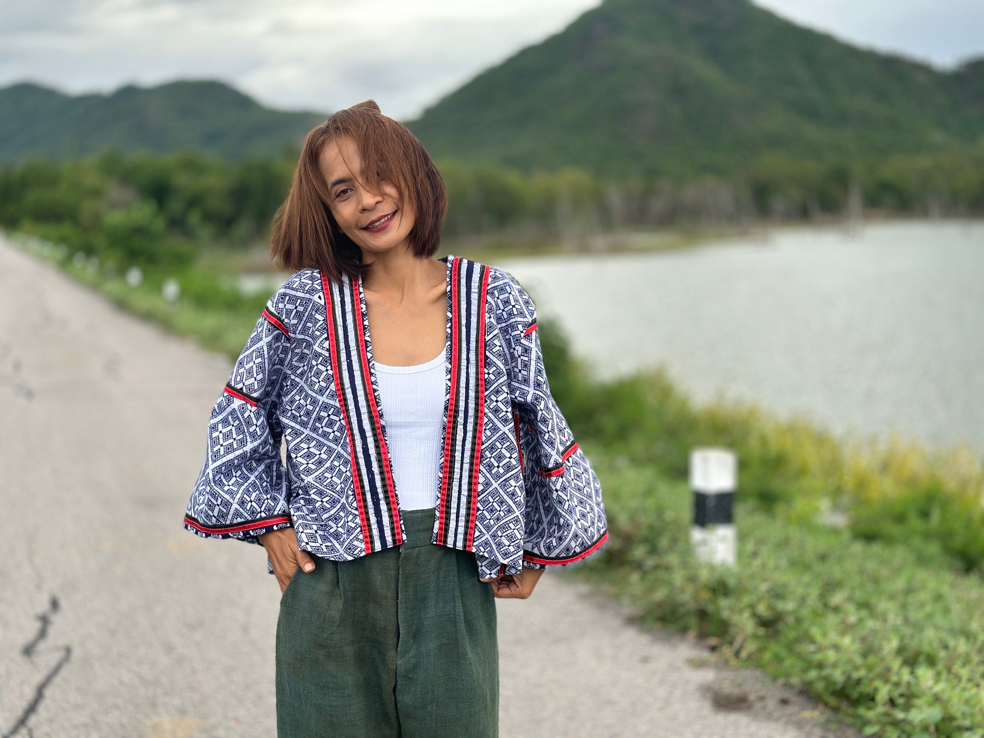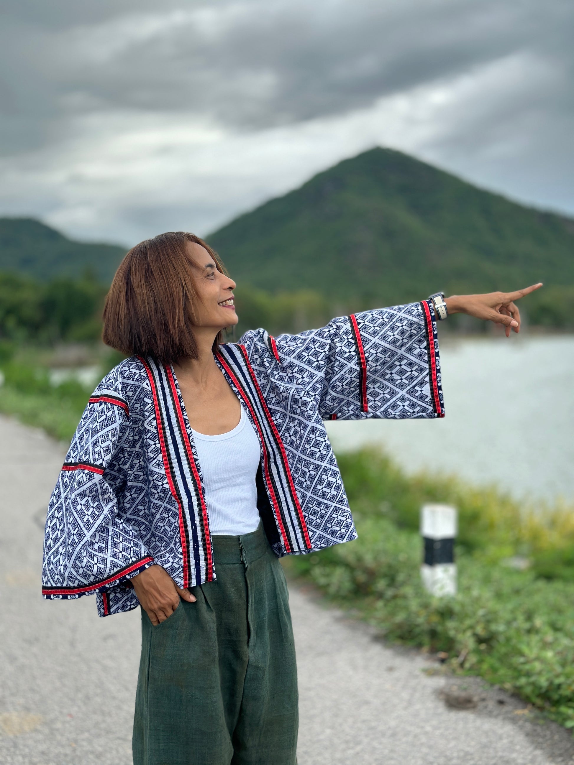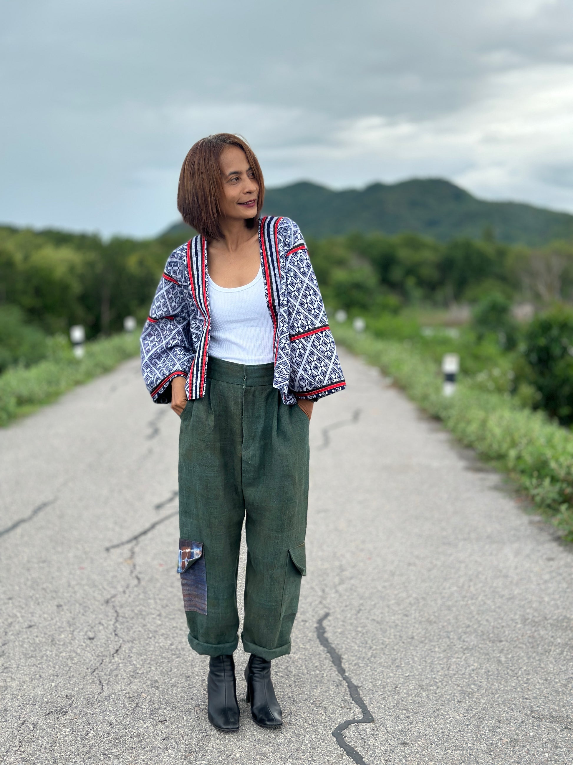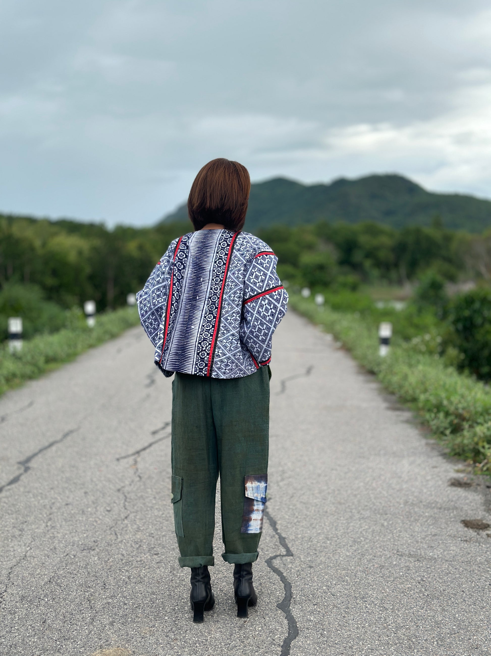 The material used for this design is a 100% genuine Hmong hill tribe fabric. Techniques used for this particular piece are traditional hand-drawn batik and patchwork details. ( see close up images)