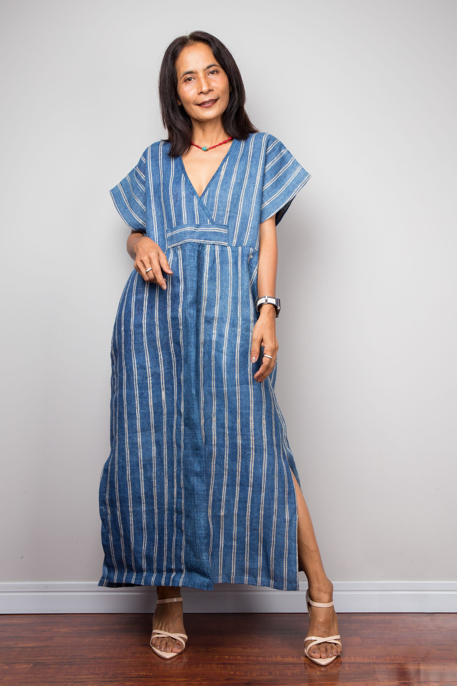 Indigo Striped Caftan Dress made from handwoven hemp for a breathable, eco-friendly feel.