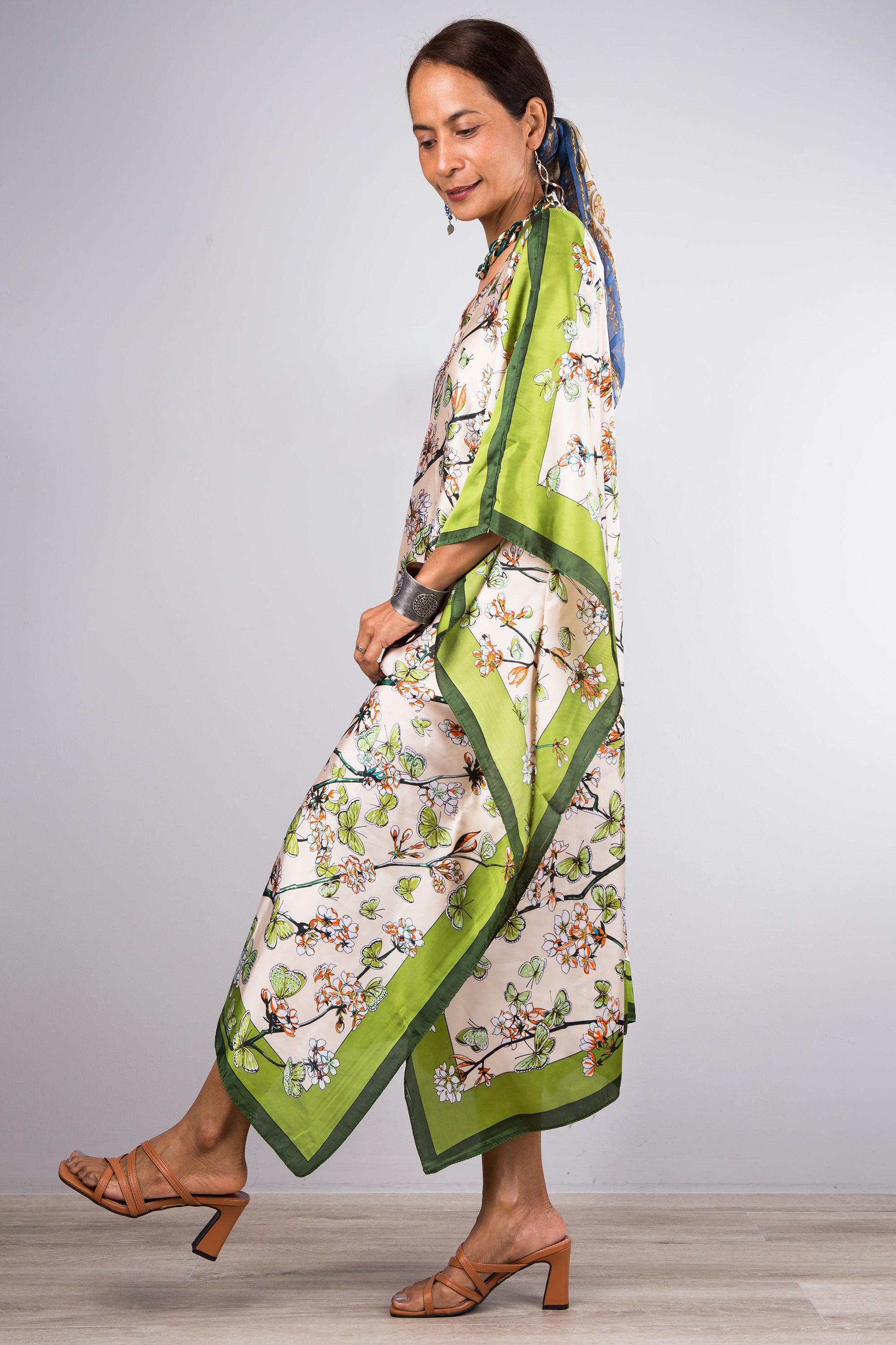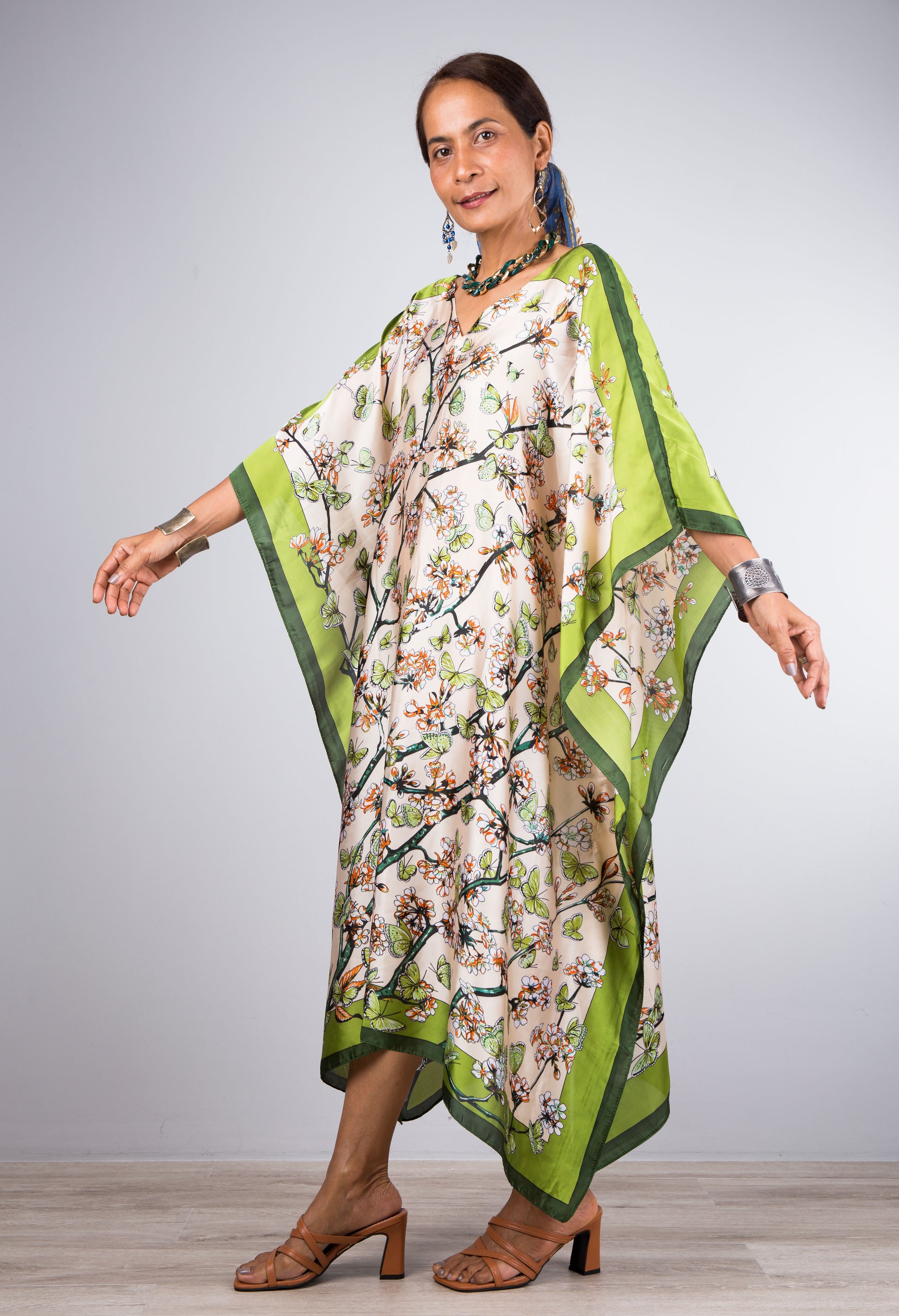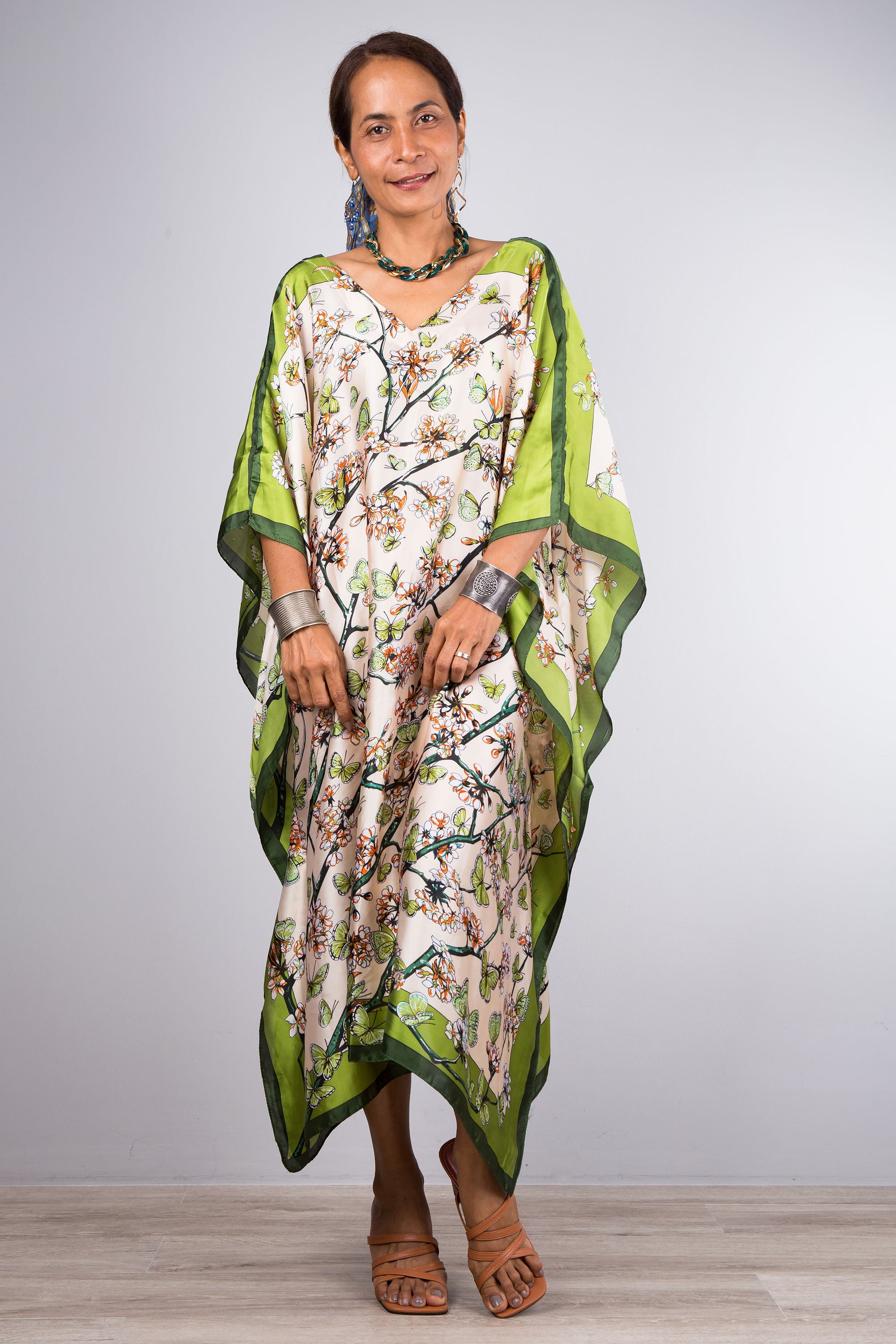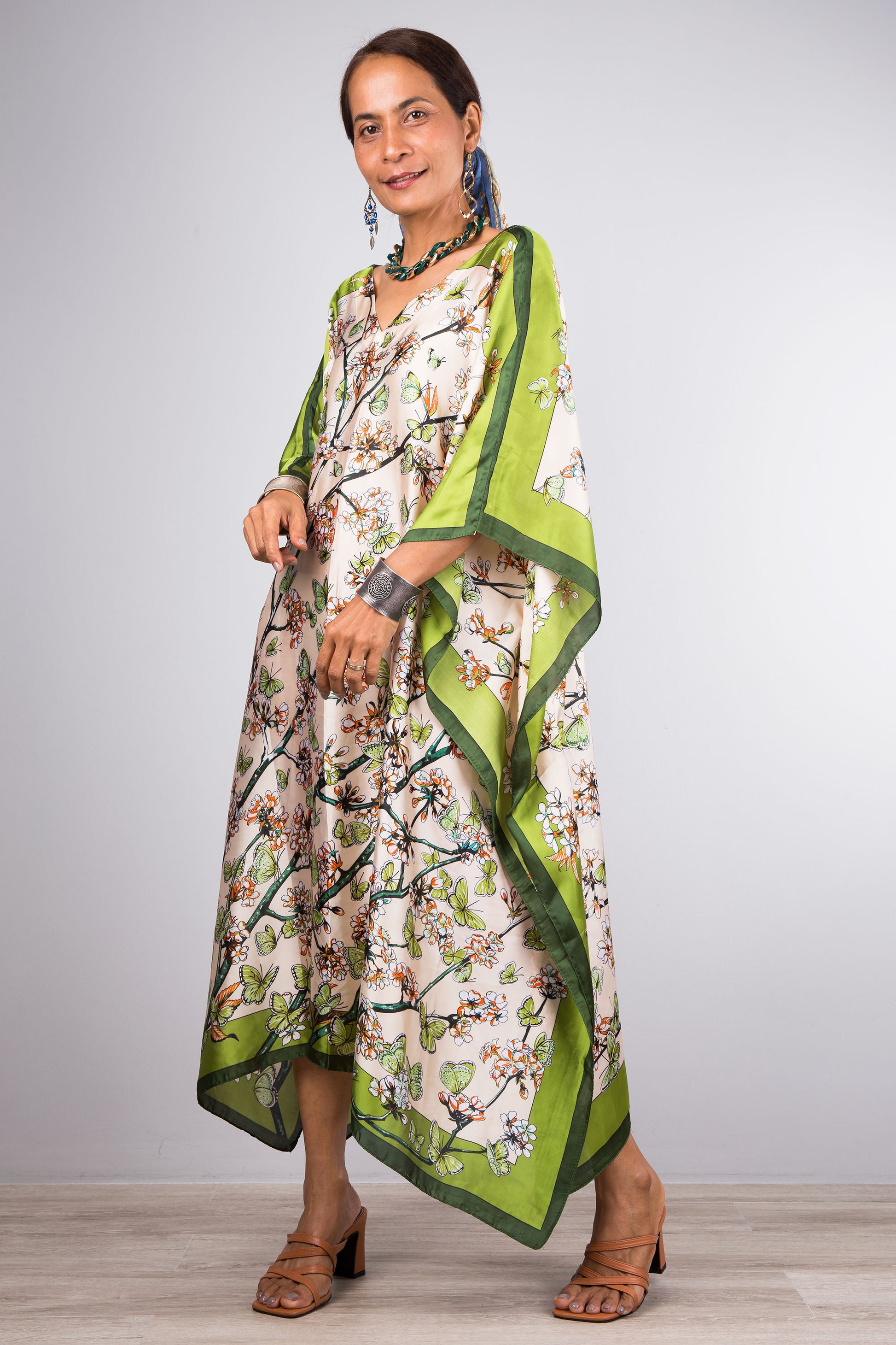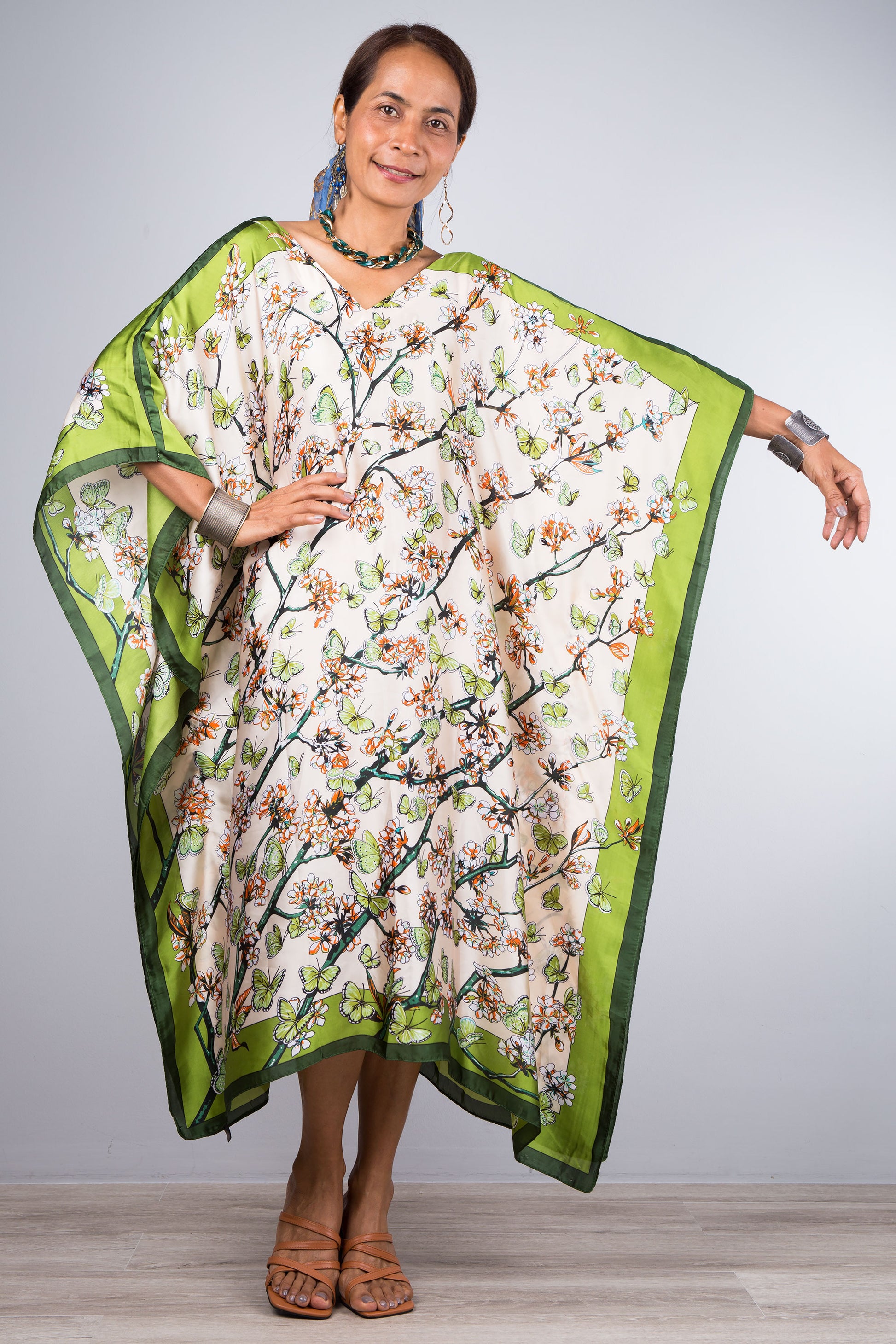 Stunning Silky Satin feel kaftan dress. This tropical floral kaftan resort dress is also suitable for plus size ladies. A bohemian caftan maxi dress with floral and butterfly print. Could also be used as a sleepwear night gown