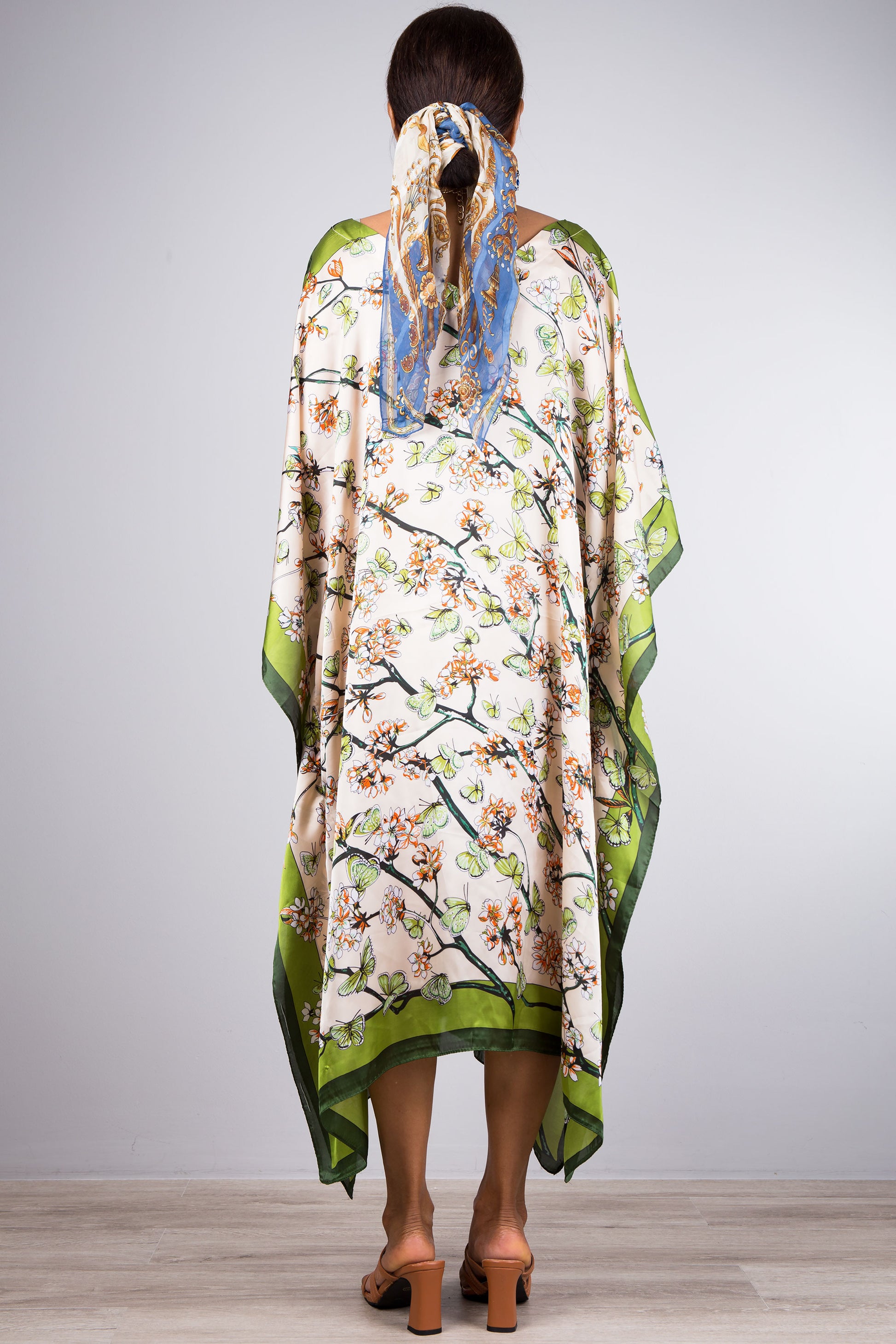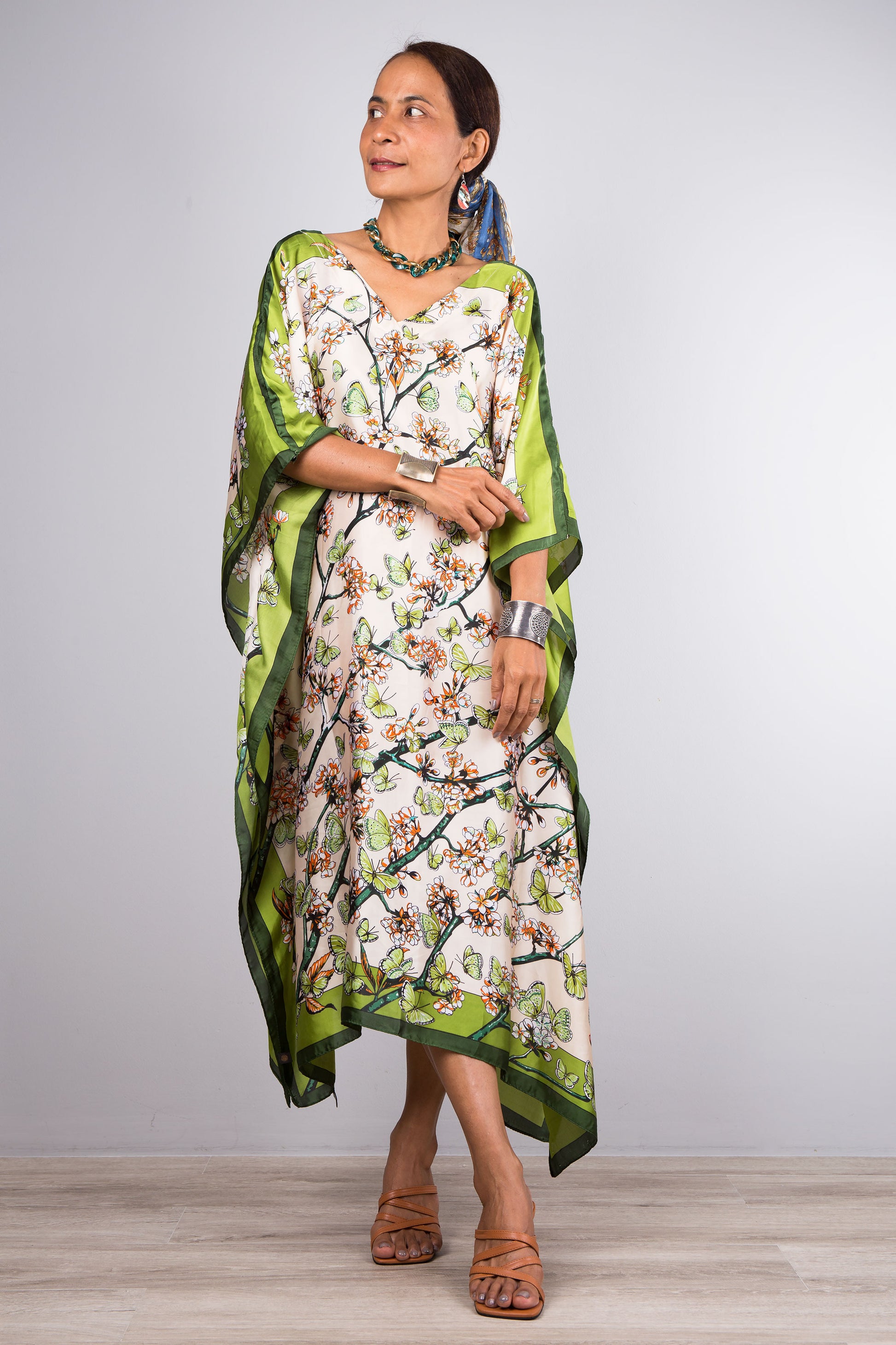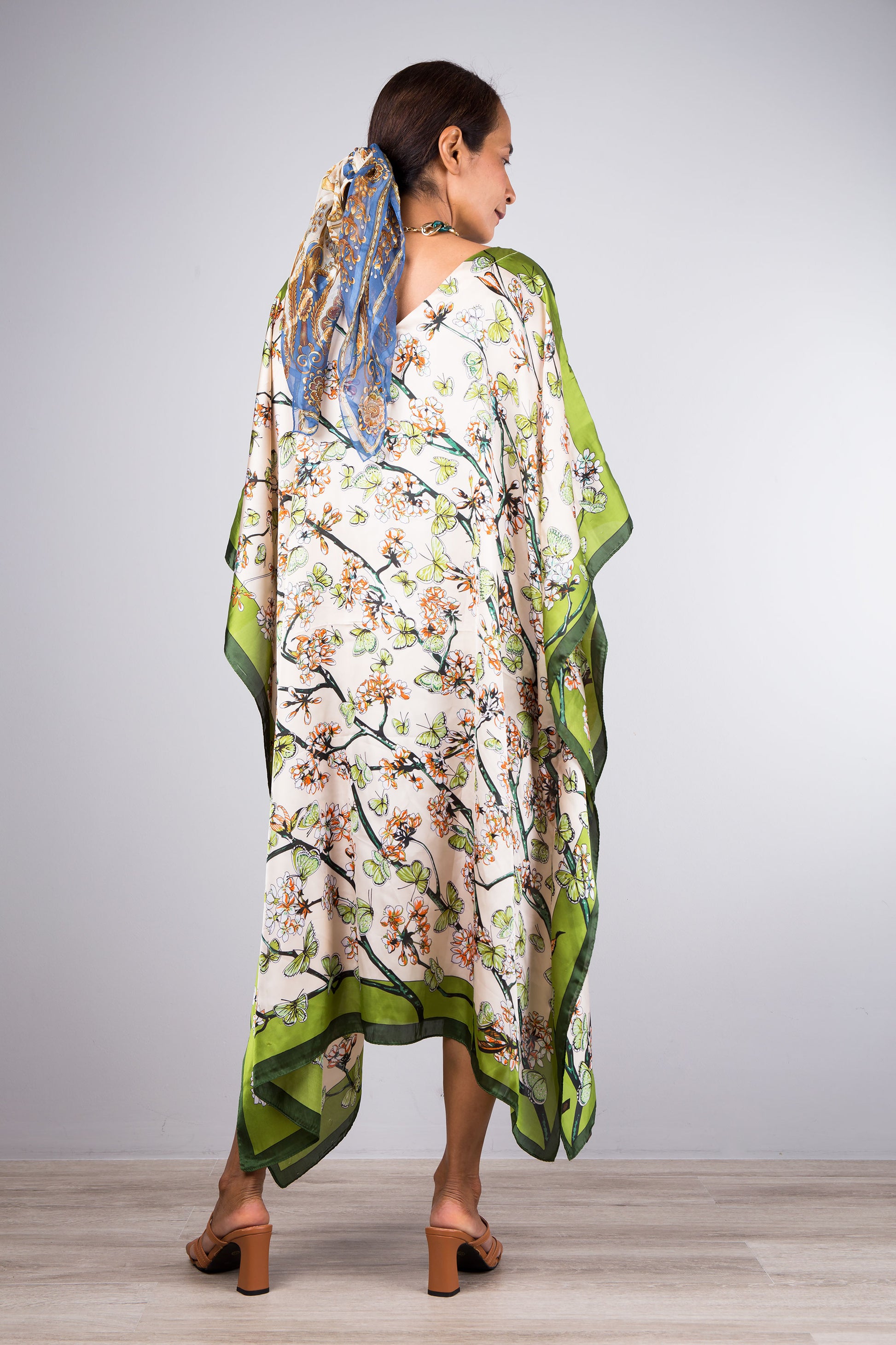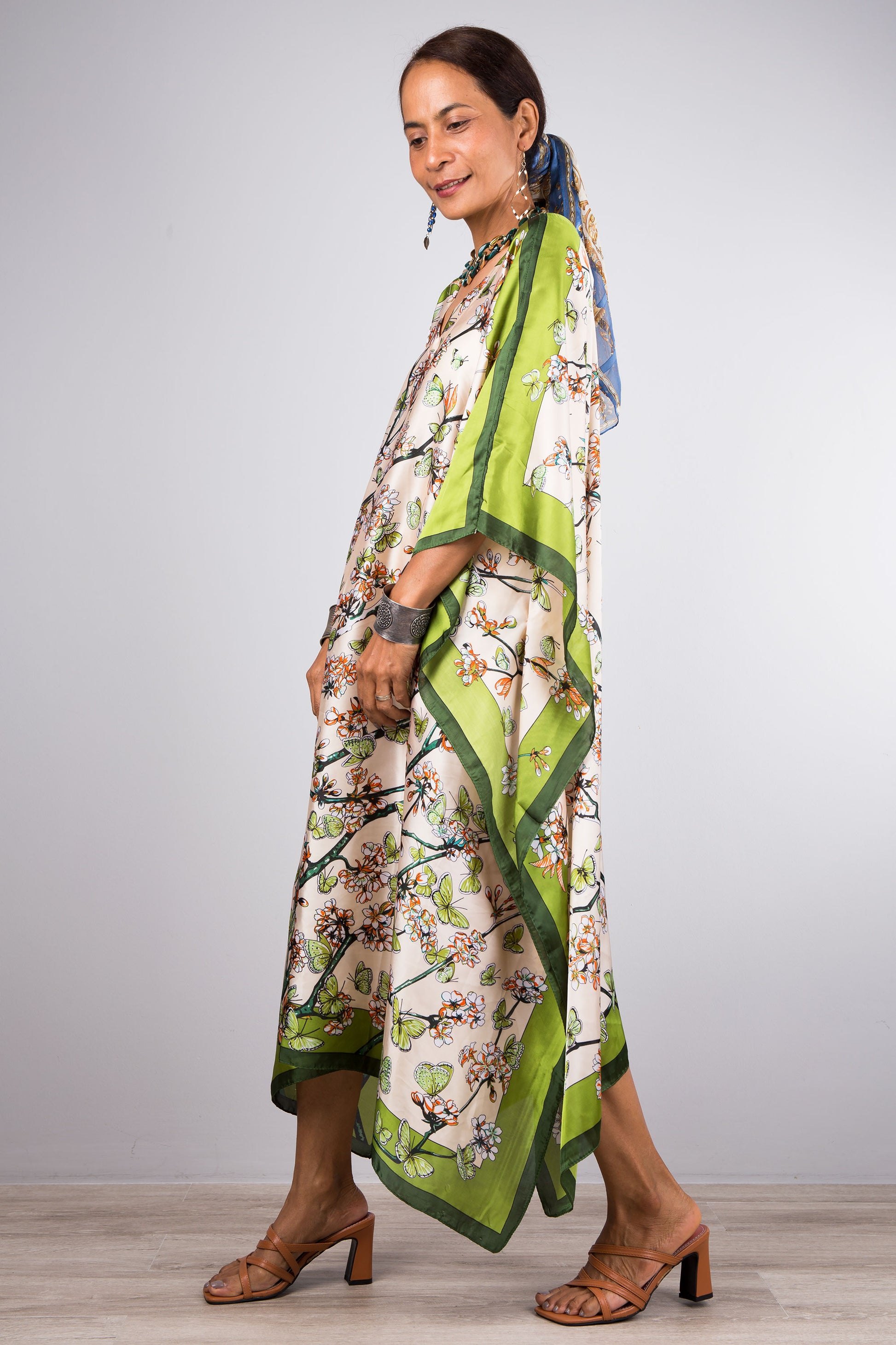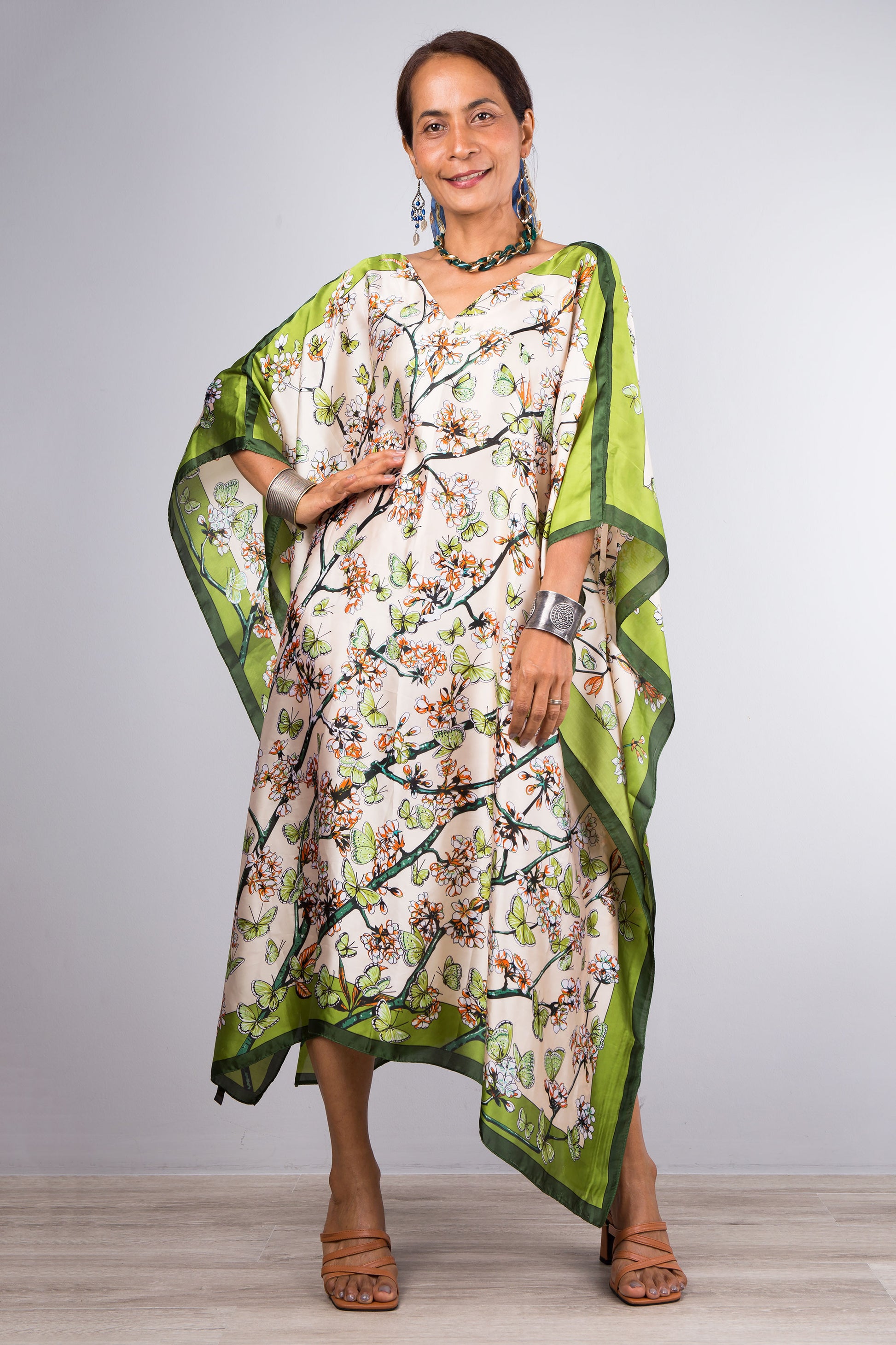 Stunning Silky Satin feel kaftan dress. This tropical floral kaftan resort dress is also suitable for plus size ladies. A bohemian caftan maxi dress with floral and butterfly print. Could also be used as a sleepwear night gown